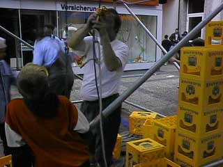 Bierträgerstapeln in luftiger Höhe; per Seil abgesichert vom THW. |